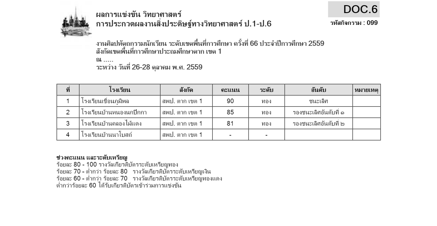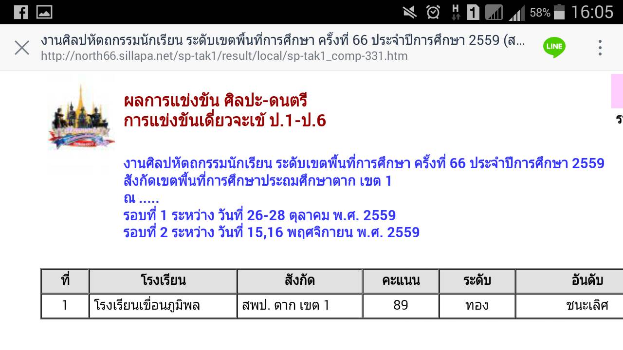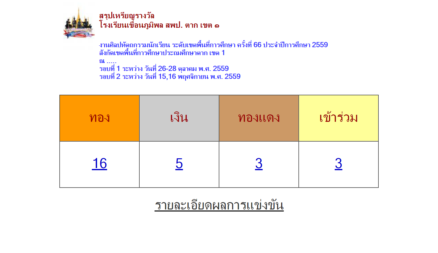 สรุปผลการแข่งขันงานศิลปหัตถกรรมนักเรียน ครั้งที่ 66 ปีการศึกษา 2559 สำนักงานเขตพื้นที่การศึกษาประถมศึกษาตาก เขต 1 โรงเรียนเขื่อนภูมิพล
