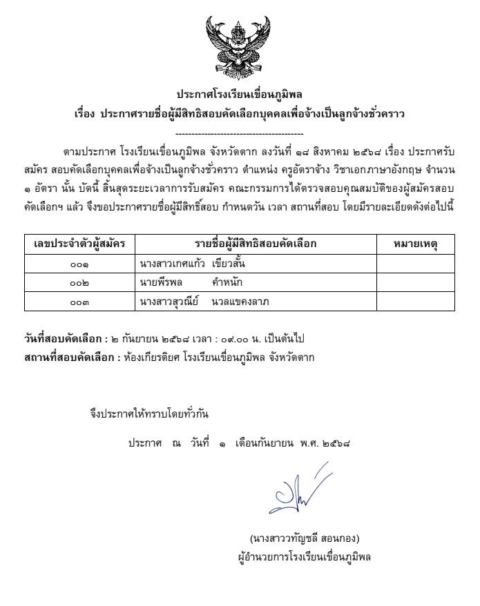 ประกาศรายชื่อผู้มีสิทธิสอบคัดเลือกบุคคลเพื่อจ้างเป็นลูกจ้างชั่วคราว ตำแหน่ง ครูอัตราจ้าง วิชาเอกภาษาอังกฤษ