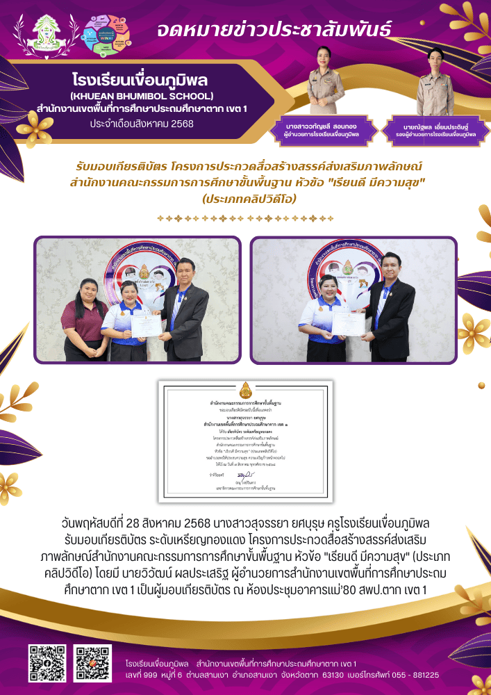 รับมอบเกียรติบัตร โครงการประกวดสื่อสร้างสรรค์ส่งเสริมภาพลักษณ์ สพฐ. ประเภทคลิปวิดีโอ